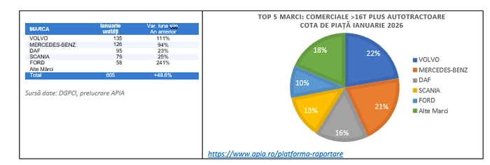 - Vehiculele comerciale grele și bus înregistrează, în ianuarie 2026, o creștere de +31.4% față ianuarie 2025, din care vehiculele comerciale grele de peste 16 tone plus autotractoarele înregistrează o creștere de +48.6%.