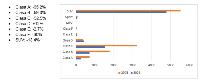 Segmentarea pe clase: În luna ianuarie 2026, față de aceeași lună a anului trecut, observăm o evoluție mixtă a segmentelor în care sunt încadrate autoturismele, după cum urmează: