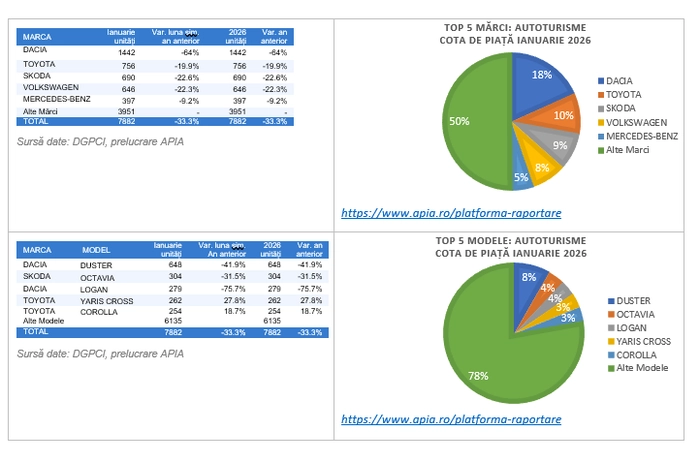 „Scăderea semnificativă a pieței auto din luna ianuarie 2026 trebuie analizată într-un context specific și previzibil pentru începutul de an. Performanța slabă a acestei luni este, în mare măsură, consecința unui efect de tracțiune artificială a înmatriculărilor către finalul anului 2025, determinat de încheierea unor serii de producție, modificări de norme și dorința actorilor din piață de a se încadra înainte de 31 decembrie, atât din rațiuni fiscale, cât și comerciale.În mod concret, luna ianuarie 2026 reflectă un gol de piață creat artificial după un final de an 2025 suprasolicitat, în care un volum semnificativ de înmatriculări a fost devansat către luna decembrie pentru a evita riscuri comerciale și de conformare la noile norme aplicabile de la 1 ianuarie. Acest transfer de volume a lăsat inevitabil un început de an subdimensionat, care nu exprimă nivelul real al cererii, ci mai degrabă efectele de calendar și de reglementare care au distorsionat distribuția vânzărilor pe parcursul ultimelor luni.”Din perspectivă structurală, se remarcă menținerea unei cote ridicate a motorizărilor electrificate pană la un maxim istoric de 71% din totalul pieței de autoturisme, semn că tranziția tehnologică continuă, însă într-un ritm influențat direct de coerența și predictibilitatea cadrului de reglementare. Primele luni ale anului vor fi esențiale pentru recalibrarea pieței, iar evoluția din perioada următoare va depinde decisiv de claritatea și stabilitatea deciziilor guvernamentale”, a transmis președintele APIA, Dan Vardie.