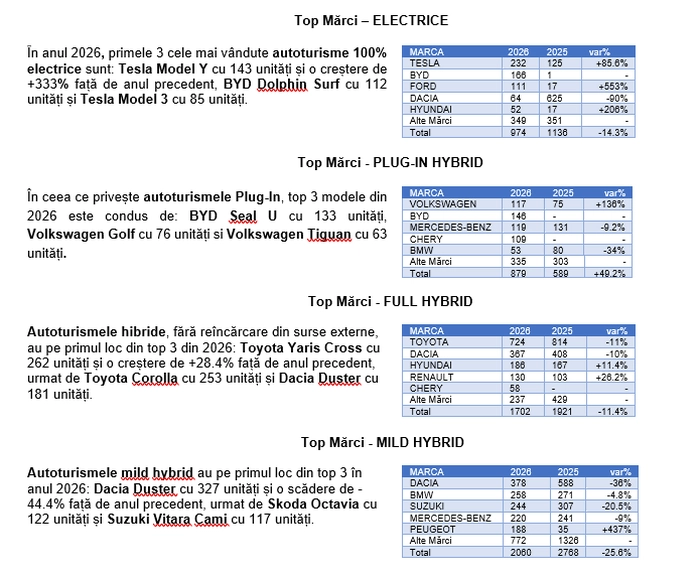 Autoturismele full electrice dețin o cotă de 12.4% din piață, în luna ianuarie a anului 2026, față de ianuarie 2025, când reprezentau 9.8%, în timp ce autoturismele plug-in hibrid dețin o cotă de piață de 11.2%, față de ianuarie 2025, când reprezentau 5%”.