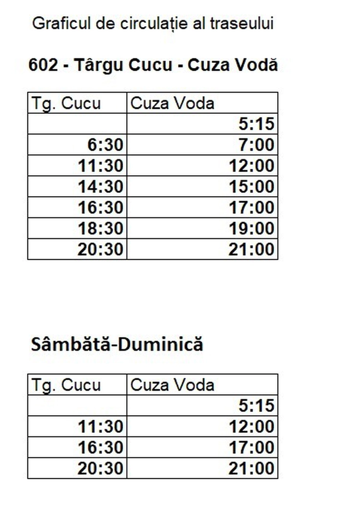 Astfel, la orele menționate în graficul de mai jos, traseul 54 devine 602, circulând pe un traseu prelungit, până în sat Cuza Vodă, pe următorul itinerariu:
