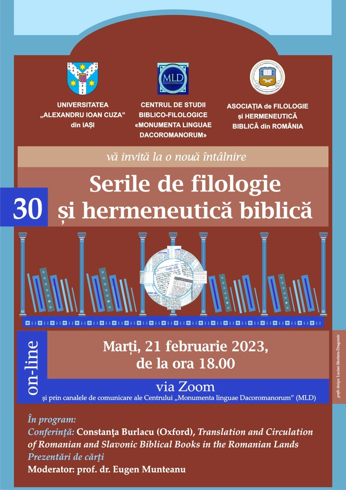 Serile de filologie şi hermeneutică biblică se desfăşoară lunar, fiind organizate de Centrul de Studii Biblico-Filologice „Monumenta linguae Dacoromanorum” (Departamentul de Ştiinţe Socio-Umane al Universităţii „Alexandru Ioan Cuza” din Iaşi) şi Asociaţia de Filologie şi Hermeneutică Biblică din România. Lista întâlnirilor poate fi consultată pe site-ul Centrului MLD.