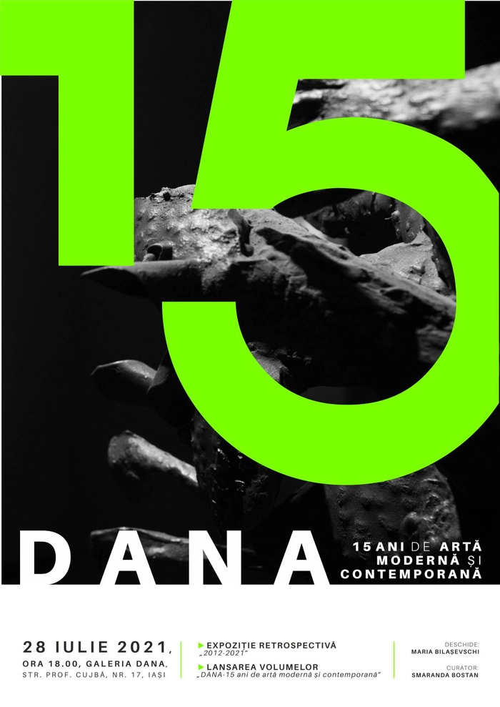 Cu acest prilej aniversar, invitam publicul iubitor de artă să ne fie alături în data de 28 iulie 2016, orele 18.00 (str. Prof. Cujba, nr. 17), la sărbătorirea celor 15 ani de activitate, ce vor fi celebrați prin deschiderea expoziției retrospective „2012-2021” și lansarea celor două volume „DANA-15 ani de artă modernă și contemporană”.