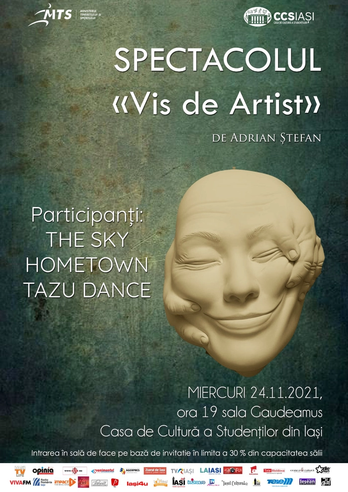 După cum v-am obișnuit, în fiecare an, în luna noiembrie, vă prezentăm o nouă premieră în regia lui Adrian Ștefan. Miercuri, 24 noiembrie, de la ora 19:00, în sala Gaudeamus a Casei de Cultură a Studenților din Iași, va avea loc spectacolul de dans „Vis de artist”. În cadrul premierei, trupele „The Sky”, „Tazu Dance” și „Hometown Dance” vor aduce în fața spectatorilor coregrafii inedite, surprinzând o gamă largă de stiluri de dans.