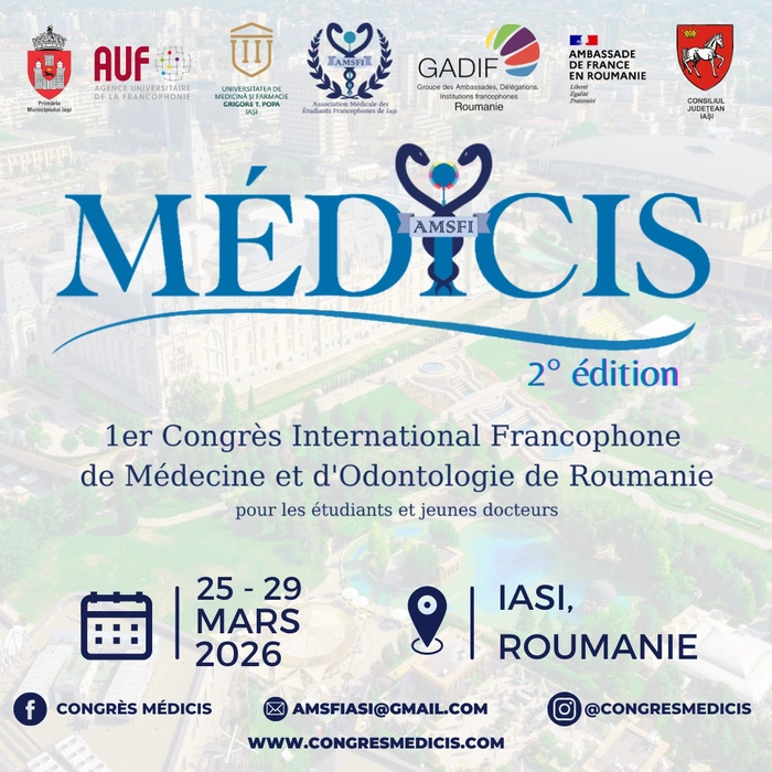Asociația Medicală a Studenților Francofoni din Iași (AMSFI), în parteneriat cu Universitatea de Medicină și Farmacie « Grigore T. Popa » din Iași, organizează cea de-a doua ediție a primului Congres Internațional Francofon de Medicină și Stomatologie – MÉDICIS, care va avea loc la Iași, în perioada 25-29 martie 2026.