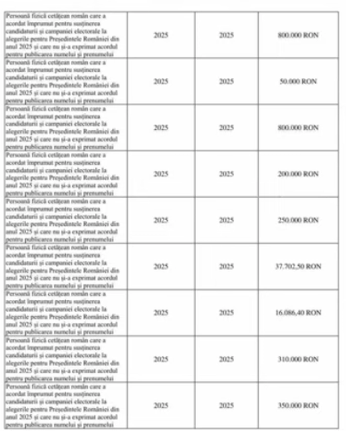 Documentele oficiale arată, de asemenea, împrumuturi consistente acordate în anul 2025, unele în valoare de 800.000 de lei, 500.000 de lei, 350.000 de lei sau 310.000 de lei, sume atribuite unor persoane fizice române care nu și-au exprimat acordul pentru publicarea identității.