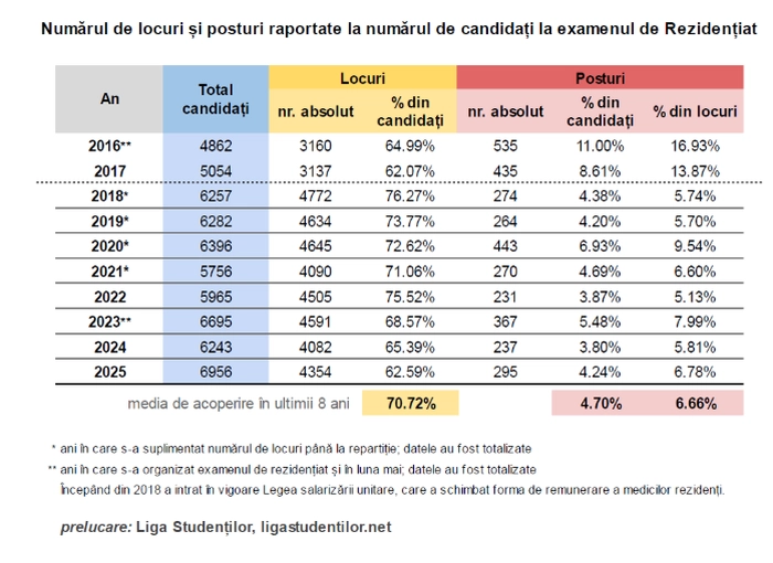 Din coroborarea datelor disponibile pe site-ul dedicat examenului de rezidențiat din ultimii opt ani, rezultă că, în medie, posturile acoperă numai 4,7% din numărul de candidați, în timp ce numărul de locuri pentru rezidențiat sunt disponibile pentru 70,72% dintre aceștia.