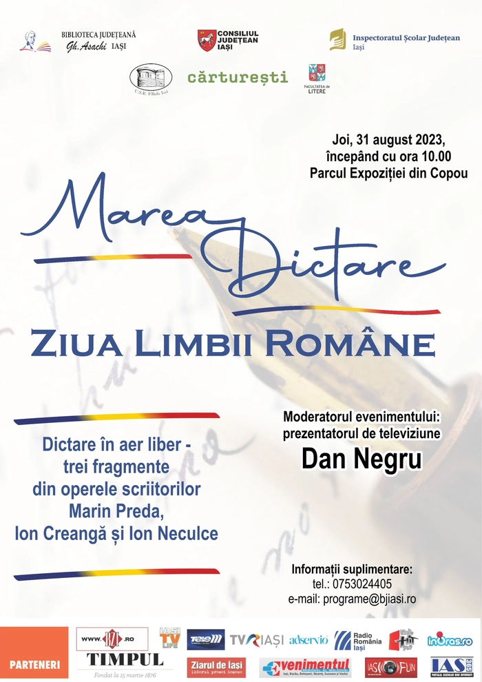 Consiliul Județean Iași și Biblioteca Județeană „Gh. Asachi”, în calitate de organizatori, cu sprijinul Inspectoratului Școlar Județean, Uniunii Scriitorilor din România – Filiala Iași, Facultății de Litere a Universității „Alexandru Ioan Cuza” și a Librăriei Cărturești vă invită joi, 31 august 2023, începând cu ora 10.00, în Parcul Expoziției din Copou pentru a sărbători împreună Ziua Limbii Române printr-un eveniment cu totul special: „Marea Dictare!” – o dictare în aer liber la care ne așteptăm să participați în număr cât mai mare, indiferent că sunteți locuitori al județului Iași sau doar în trecere prin oraș.