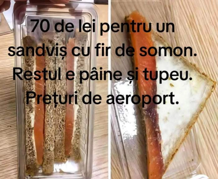 „70 de lei pentru un sandwich cu fir de somon. Restul e pâine și tupeu. Prețuri de aeroport“, a scris persoana respectivă, pe TikTok.