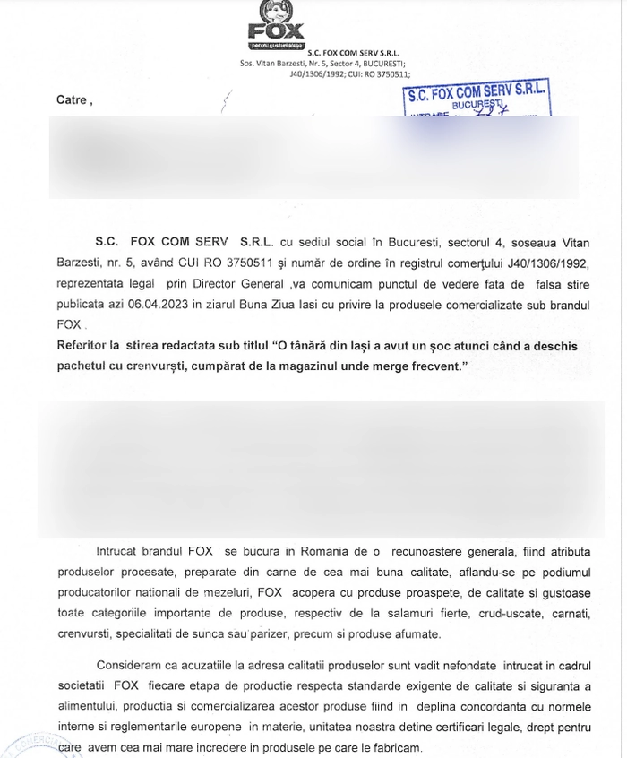 Menționăm faptul că unele paragrafe au fost blurate în dreptul la replică al companiei pentru că apar informații cu caracter confidențial.