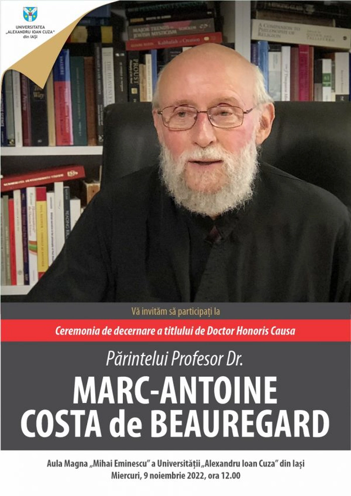 Miercuri, 9 noiembrie, la ora 12.00, în Aula Magna „Mihai Eminescu” va avea loc ceremonia de decernare a titlului de Doctor Honoris Causa al Universității „Alexandru Ioan Cuza” din Iași Părintelui Profesor Dr. Marc-Antoine Costa de Beauregard.