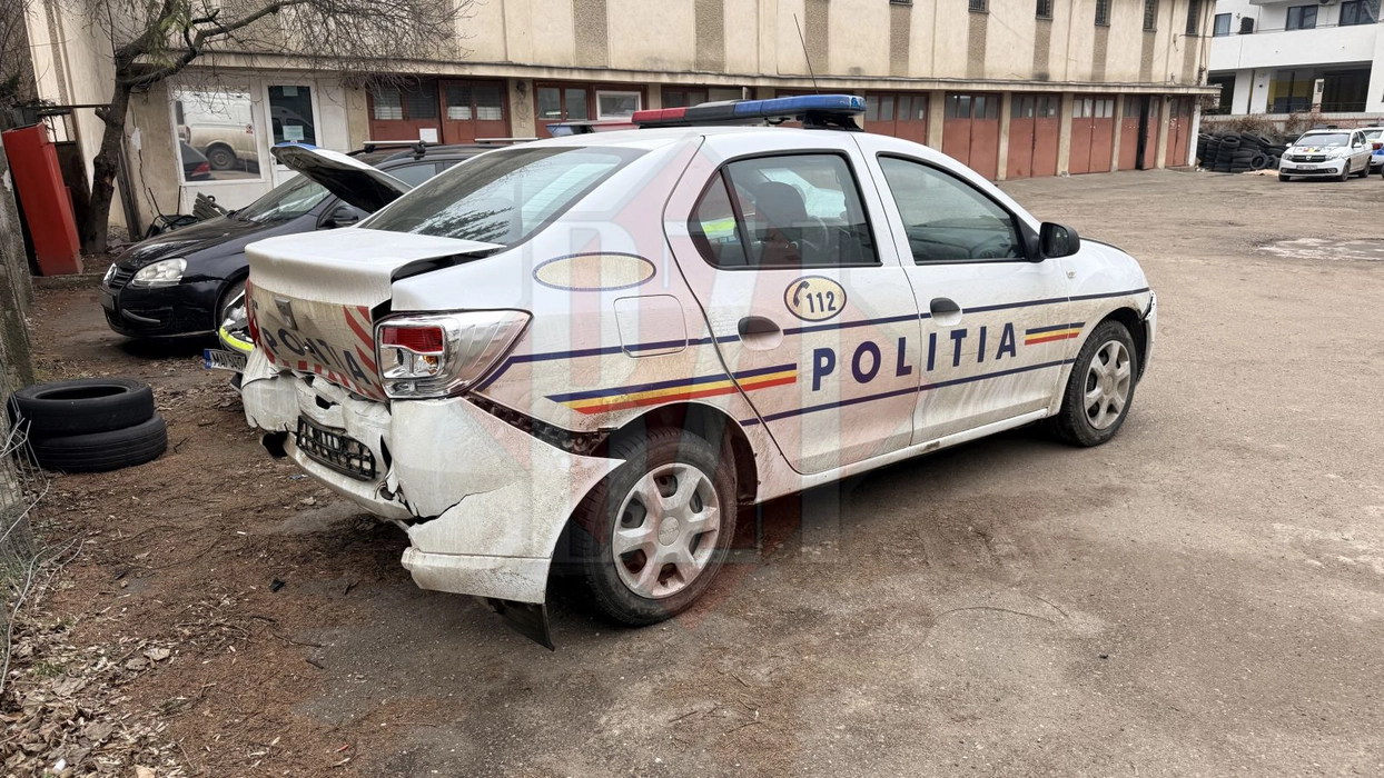 Accident neobișnuit în Copou: două autospeciale de poliție s-au izbit violent, iar una dintre ele a fost proiectată într-un autoturism. Erau conduse de polițiști de 21 și 23 de ani