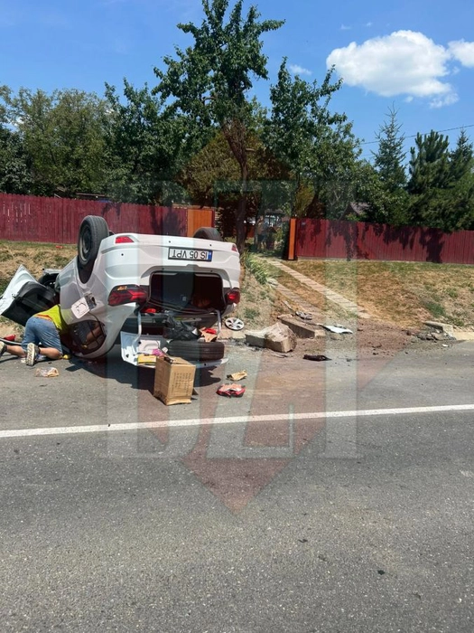 Accident rutier extrem de violent. Explozia unei anvelope l-a făcut pe șofer să intre într-un cap de pod. Autoturismul s-a răsturnat -FOTO