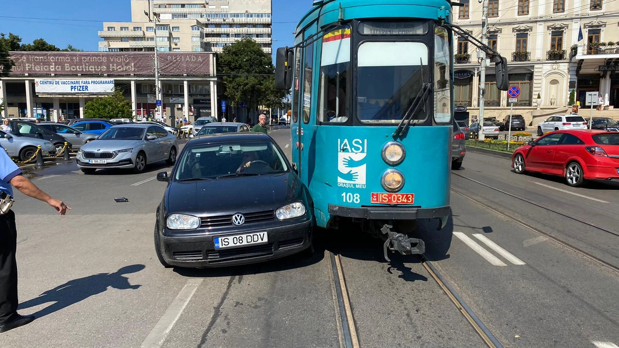 Accident rutier în Piaţa Unirii. Coliziune dintre un tramvai şi un autoturism, după o manevră neinspirată a unei şoferiţe – EXCLUSIV, FOTO, VIDEO