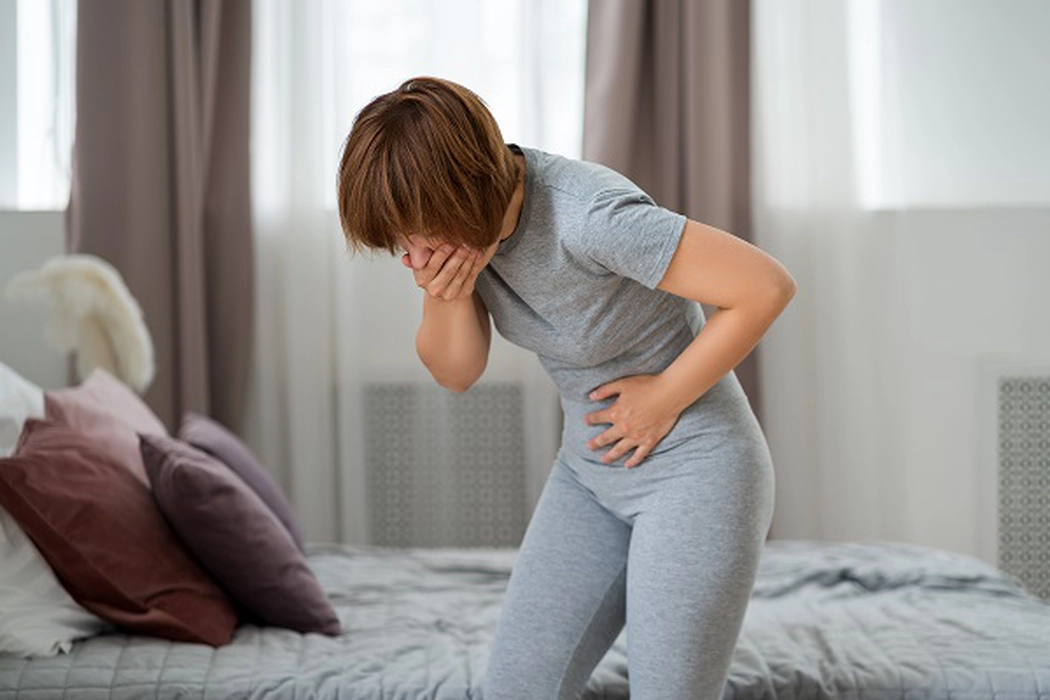 Stomach ache, symptoms of gastritis or pancreatitis, woman with abdominal pain suffering at home, health problems concept