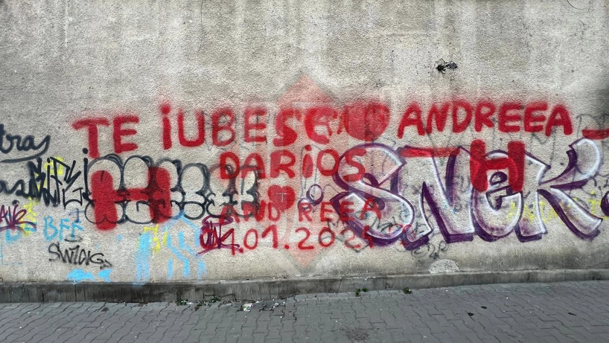 Declarație de dragoste la limita legii, înainte de Ziua Îndrăgostiților la Iași. Mesaj uriaș scris cu vopsea roșie pe fațada unui bloc din cartierul Alexandru cel Bun
