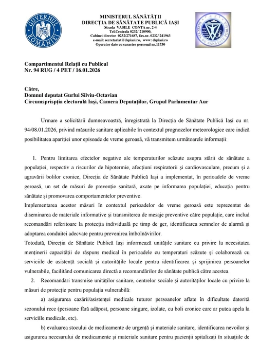 Deputatul Silviu Gurlui a primit răspuns de la DSP Iași cu privire la măsurile luate pentru protecția populației în perioada de ger