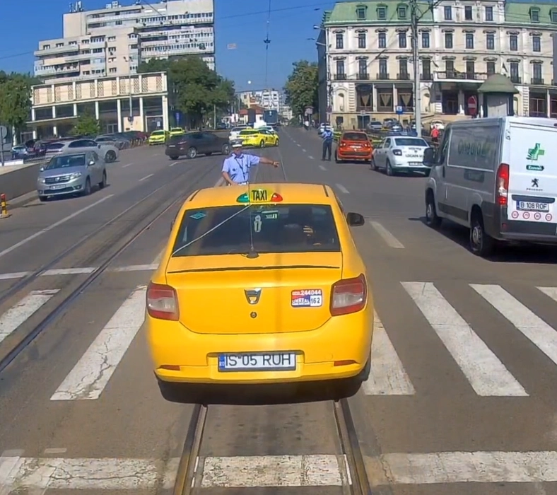 Imagini de pe camera de bord! Iată cine a apărut de după tramvai, în Piața Unirii, în fața unui taximetrist. A fost șocul vieții sale