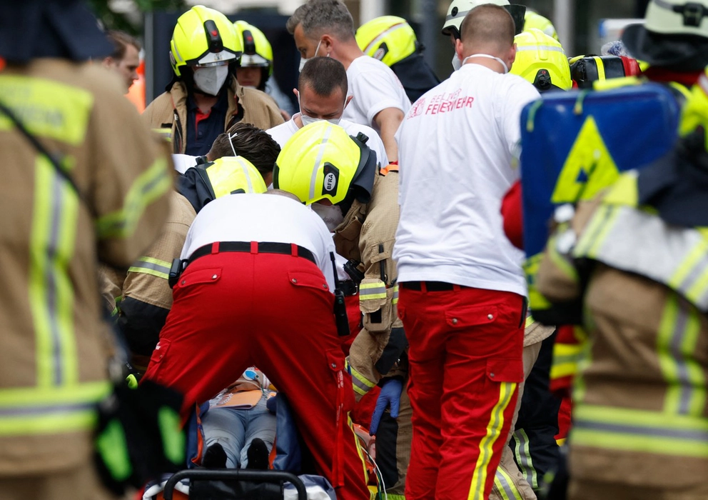 Rescue workers help injured people at the site where one person was killed and eight injured when a car drove into a group of people in central Berlin, on June 8, 2022. A police spokeswoman said the driver was detained at the scene after the car ploughed into a shop front in a busy shopping street in Charlottenburg district. It was not clear whether the crash was intentional.,Image: 697978150, License: Rights-managed, Restrictions: , Model Release: no, Credit line: Profimedia