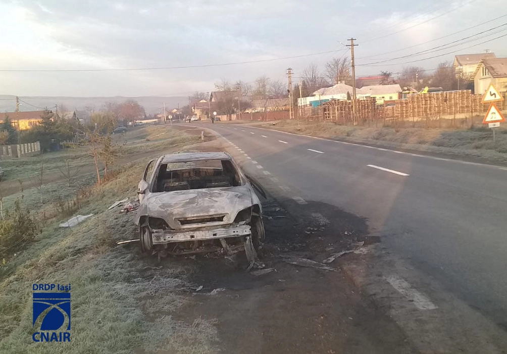 O maşină a fost găsită carbonizată pe marginea DN 28, Răducăneni, județul Iași