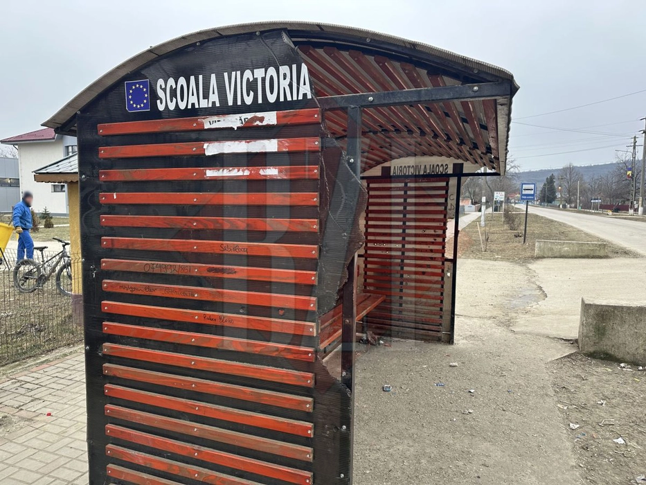 O stație de autobuz din comuna Victoria, vandalizată de elevii de la școală. Locul este plin de mesaje obscene, chiștoace de țigări și mizerie