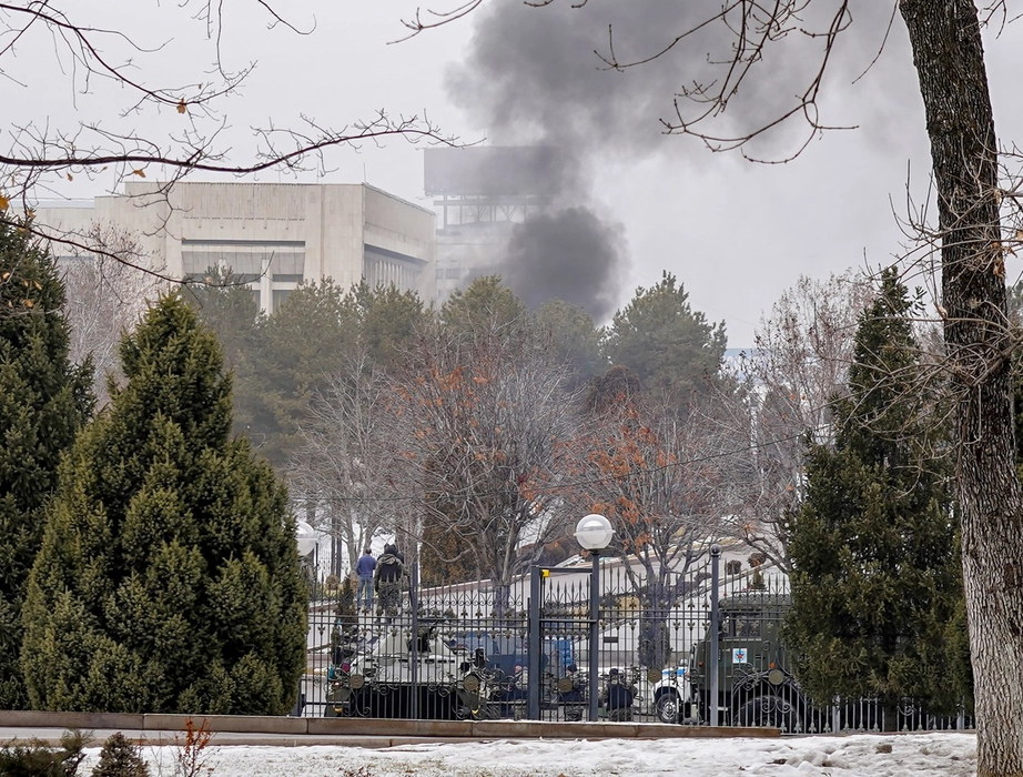 Smoke raises over an administrative building as unprecedented protests over a hike in energy prices spun out of control in central Almaty on January 5, 2022,Image: 650714242, License: Rights-managed, Restrictions: , Model Release: no, Credit line: Profimedia