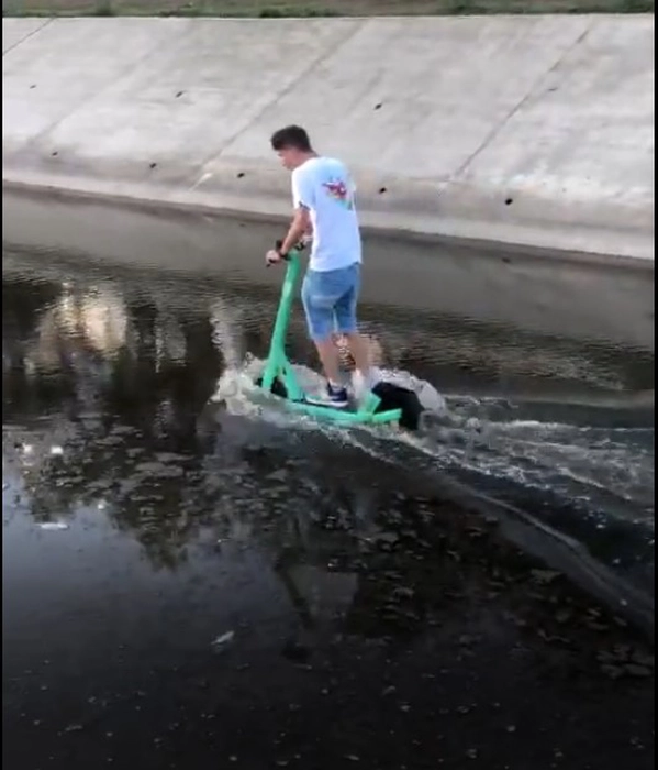 Râul Bahlui a devenit navigabil. Iată ce face un tânăr cu o trotinetă electrică – FOTO, VIDEO