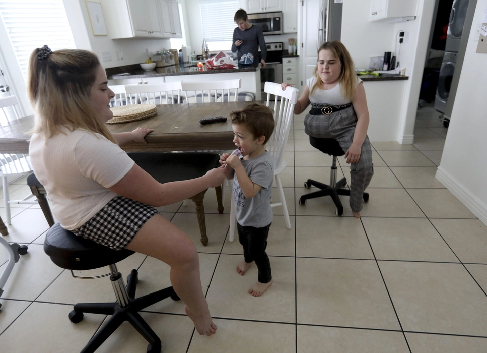 Kendra, left, and Maliyah Herrin feed their nephew, Ezra, a snack at their North Salt Lake home on Wednesday, Dec. 4, 2019.