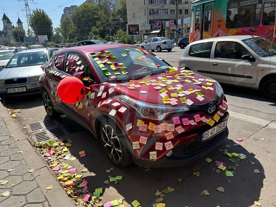 Surpriză de proporții la Iași. Zeci de bilețele cu „La mulți ani!” au fost lipite pe un autoturism