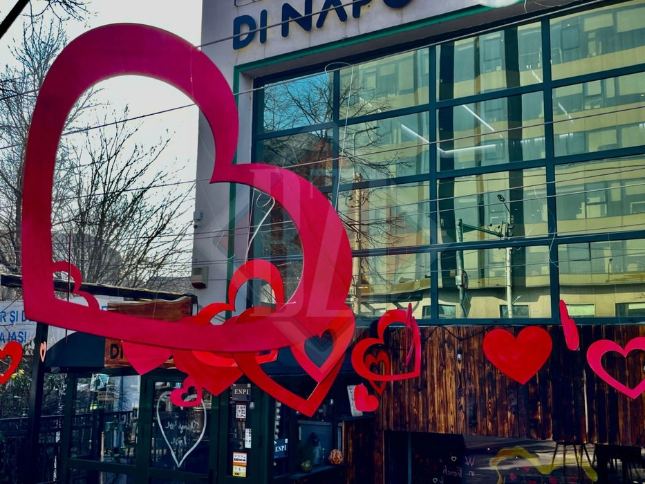 Zeci de inimioare roșii decorează un restaurant din centrul Iașului. Trecătorii se opresc să facă fotografii