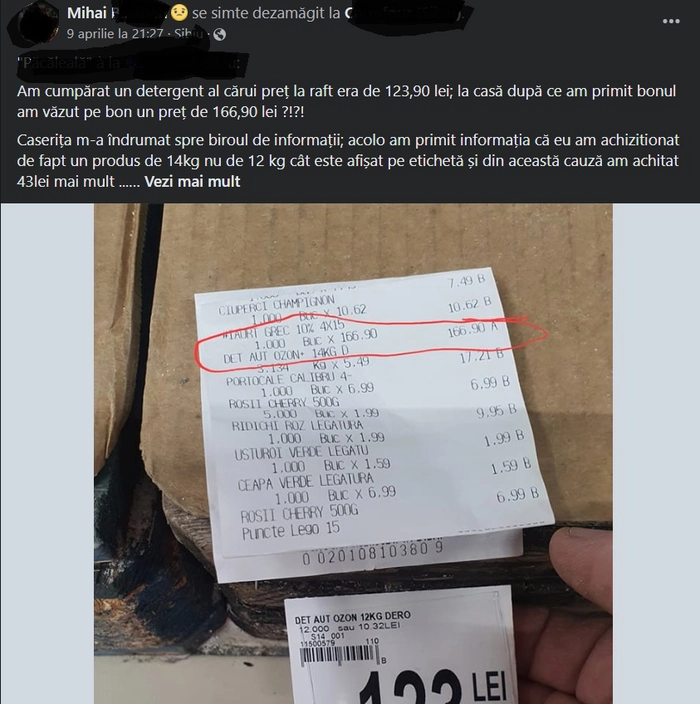 „Am cumpărat un detergent al cărui preț la raft era de 123,90 lei, la casă după ce am primit bonul am văzut pe bon un preț de 166,90 lei ?!?!