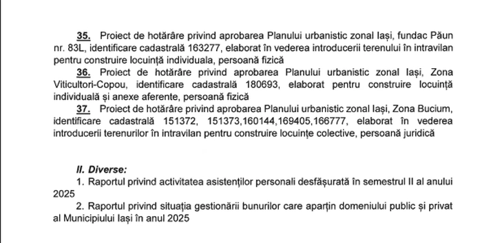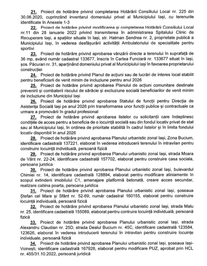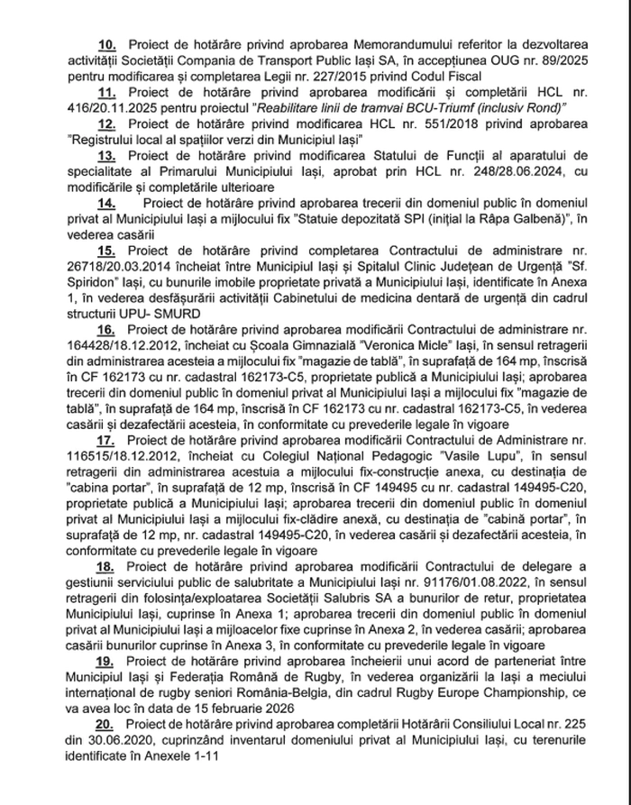 Vineri, 30 ianuarie 2026, de la ora 10.00, plenul Consiliului Local Iași se reunește pentru a supune la vot 65 de proiecte de hotărâre.