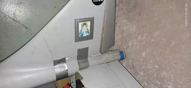 O fotografie distribuită pe platformele social media arată o dronă Orlan-10 doborâtă de ucrainenii care au descoperit că militarii ruși au lipit o icoană de aparatul de zbor fără pilot.