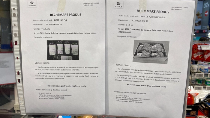 Hypermarketul Selgros Iaşi a anunţat rechemarea a două produse contaminate cu Salmonella Enteritidis: ficat de pui şi aripi de pui cu os şi piele.