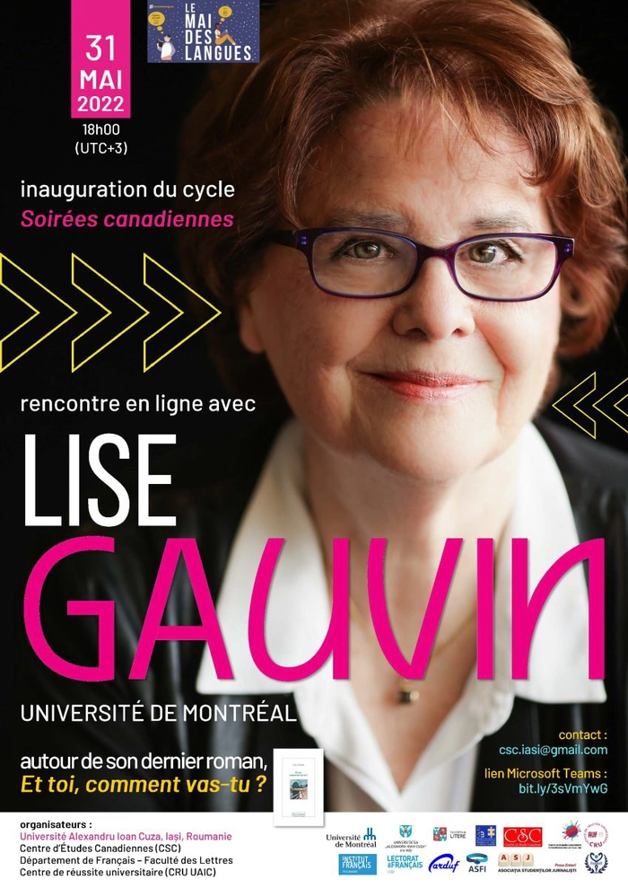 Marți, 31 mai 2022, 18.00-20.00, va avea loc o întâlnire online cu Lise GAUVIN (Université de Montréal) pe marginea ultimului său roman, Et toi, comment vas-tu ? (Des femmes-Antoinette Fouque, 2022 [Leméac, 2021])